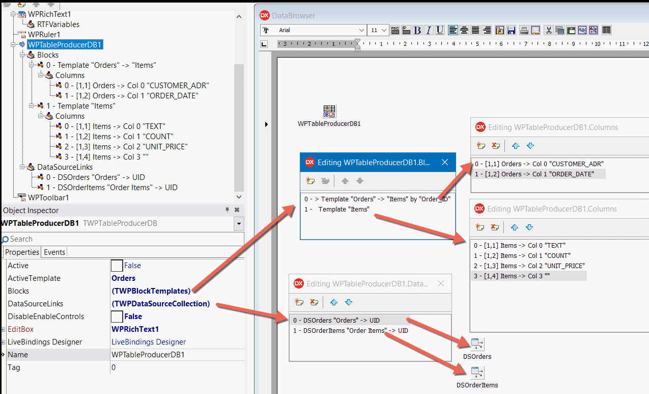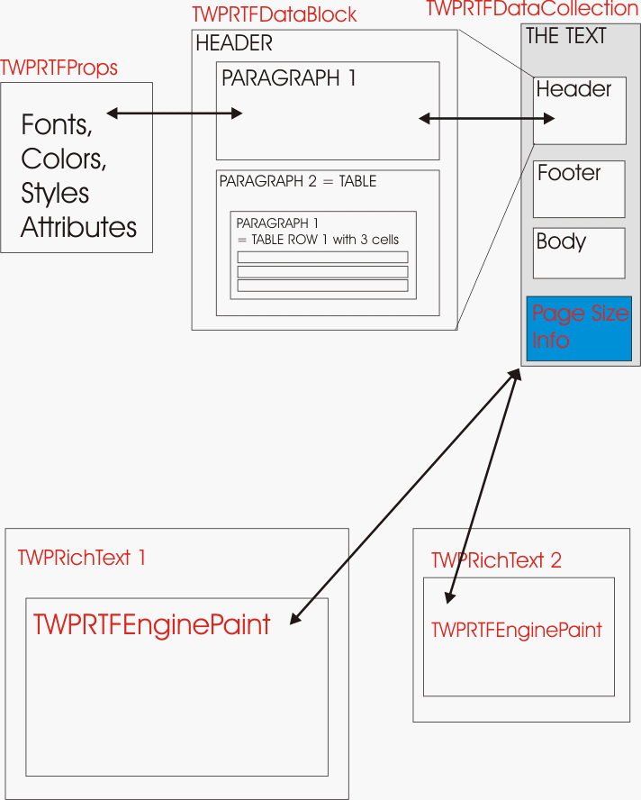 The concept allows it that several TWPRichText (inherits of TWPCustomRtfEdit) memo objects use the same TWPRTFDataCollection. Normally you will use the TWPRTFStorage component to initialized the connected memo objects. The same class can be also used to create a chain of editors with each editor showing a different page of the document (text path).