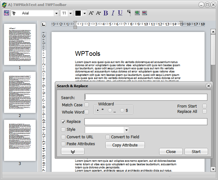 WPTools also includes a TWPPreview component which will display the text which is loaded by a different TWPRichText memo control. It also includes a very powerful preview dialog (TWPPreviewDlg). The support for paragraph styles is very powerful and ready to use, due to the included dialogs TWPOneStyleDlg and TWPStyleDlg.